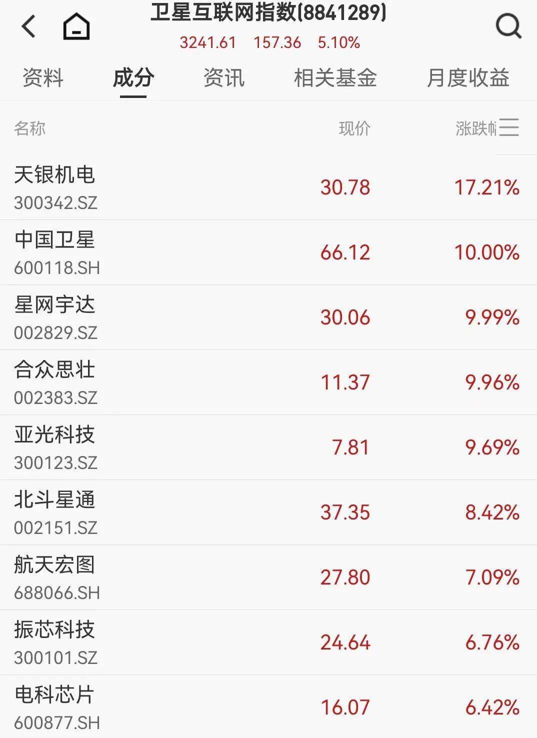10万亿超等赛谈爆发,超20股集体涨停贬抑收盘,卫星互联网见解指数涨幅超5%。中国卫星、航天能源、新劲刚、超捷股份、新雷能、有研粉材等多股20CM涨停;九更始材、天通股份、中超控股等20余股涨停,天银机电涨幅超17%。